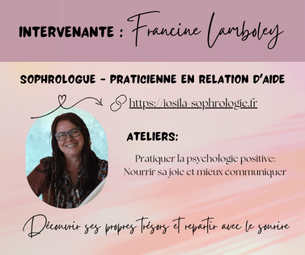 Paiement à l'inscription , s'inscrire OBLIGATOIREMENT par SMS au 06 82 86 41 74 ou email francine@iosila-sophrologie.fr